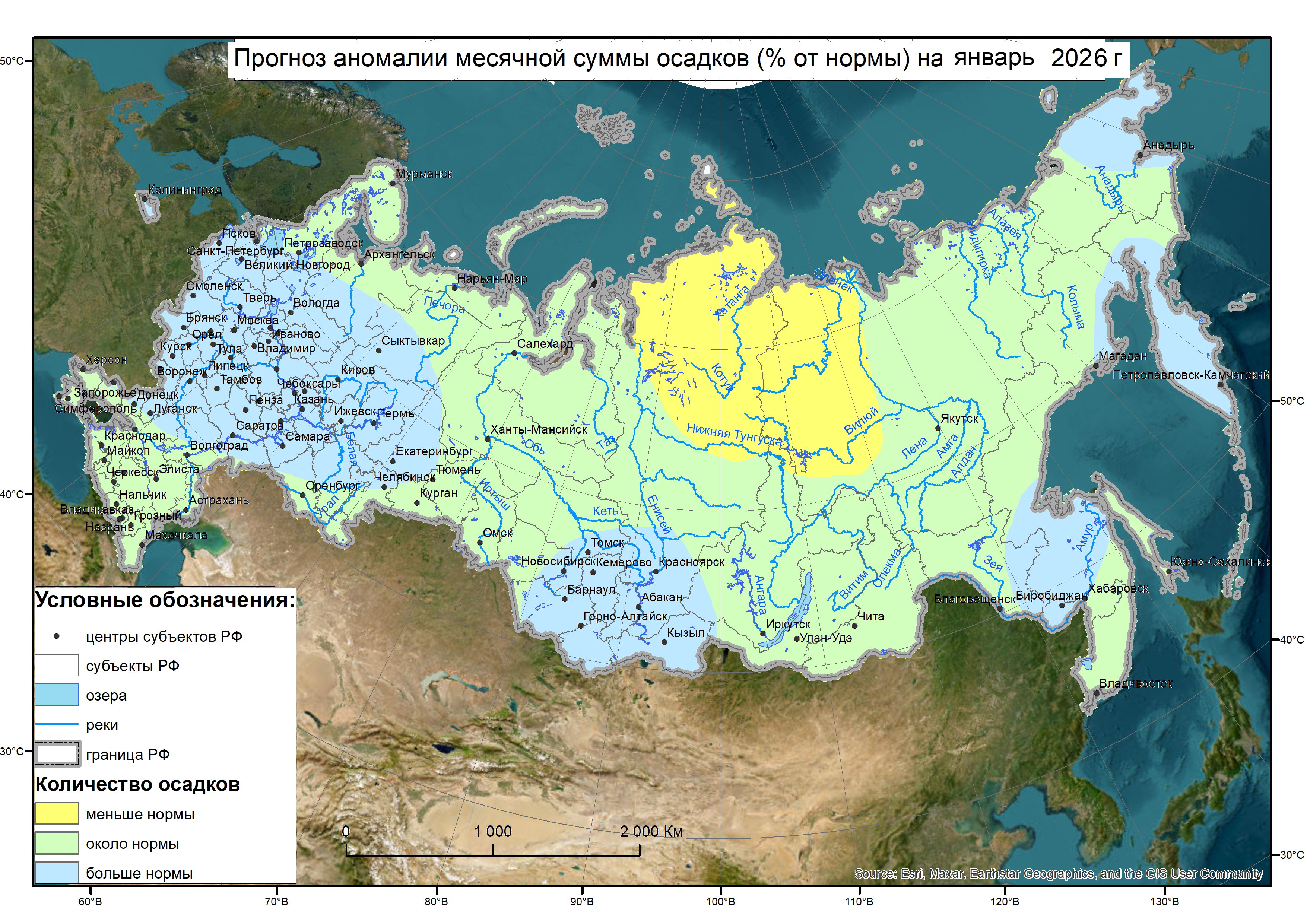 Ожидаемое распределение аномалии температуры воздуха и количества осадков в январе 2026 г.