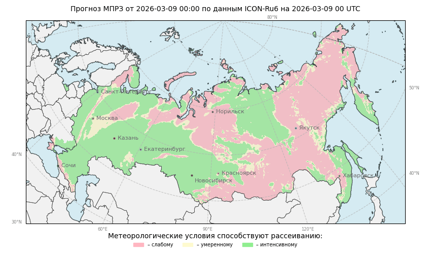 МПРЗ - метеорологический показатель рассеивания и загрязнения приземного воздуха. Метод расчета МПРЗ (разработан в ФГБУ «Гидрометцентр России», авт. д.г.н. Кузнецова И.Н., к.н. Ткачева Ю.В.) основан на учете скорости переноса в пограничном слое атмосферы, типа термической устойчивости и осадков. (Описание метода и алгоритма расчета). Для прогноза МПРЗ используются прогностические величины метеорологических параметров оперативной мезомасштабной модели атмосферы COSMO-RU с горизонтальным разрешением около 7 км.