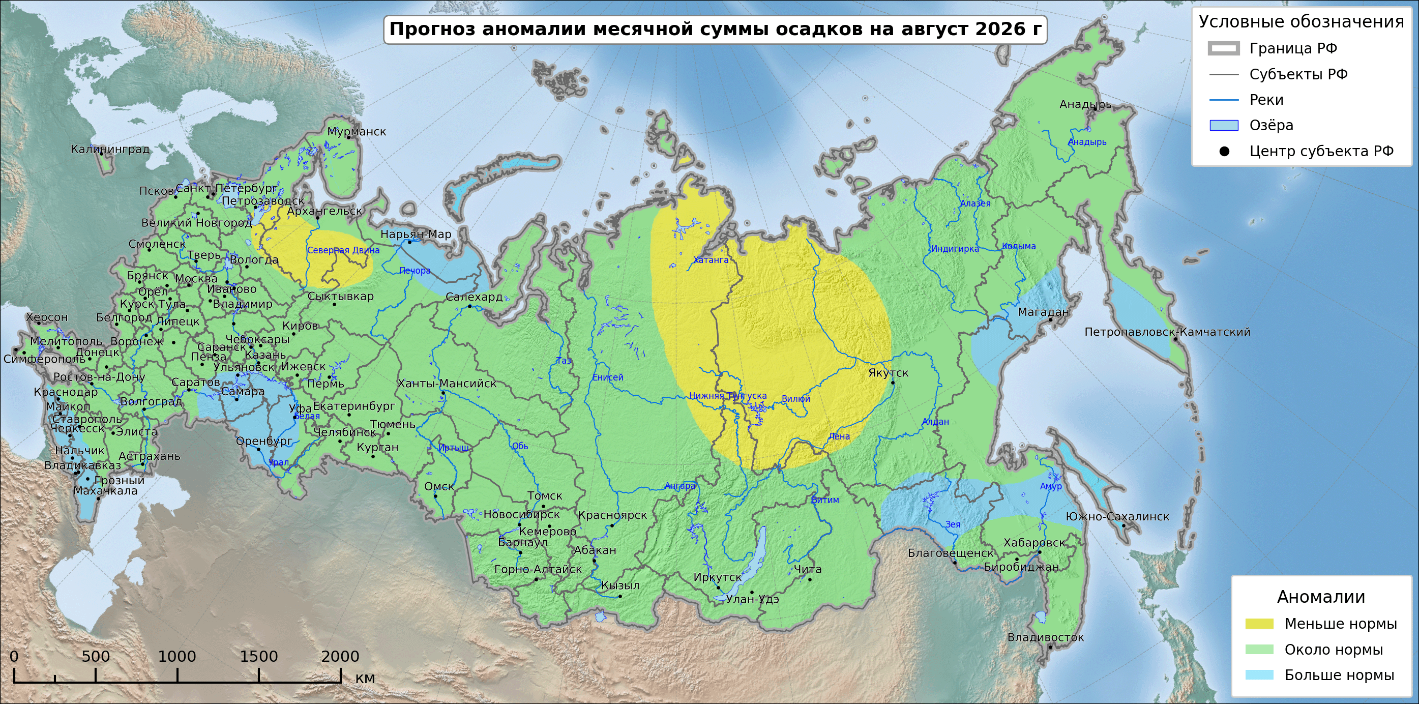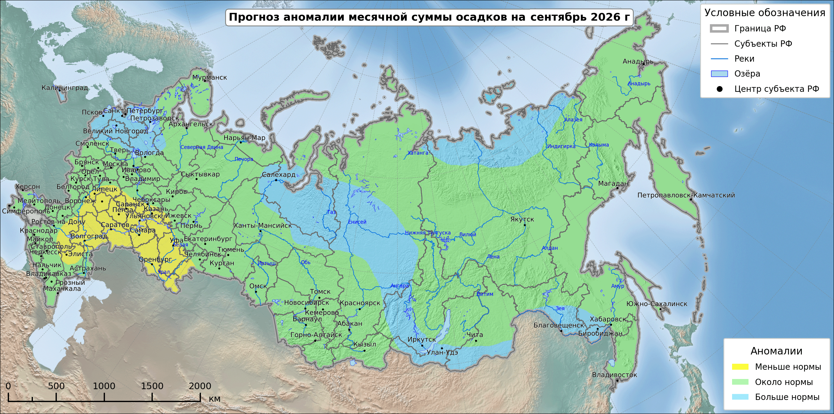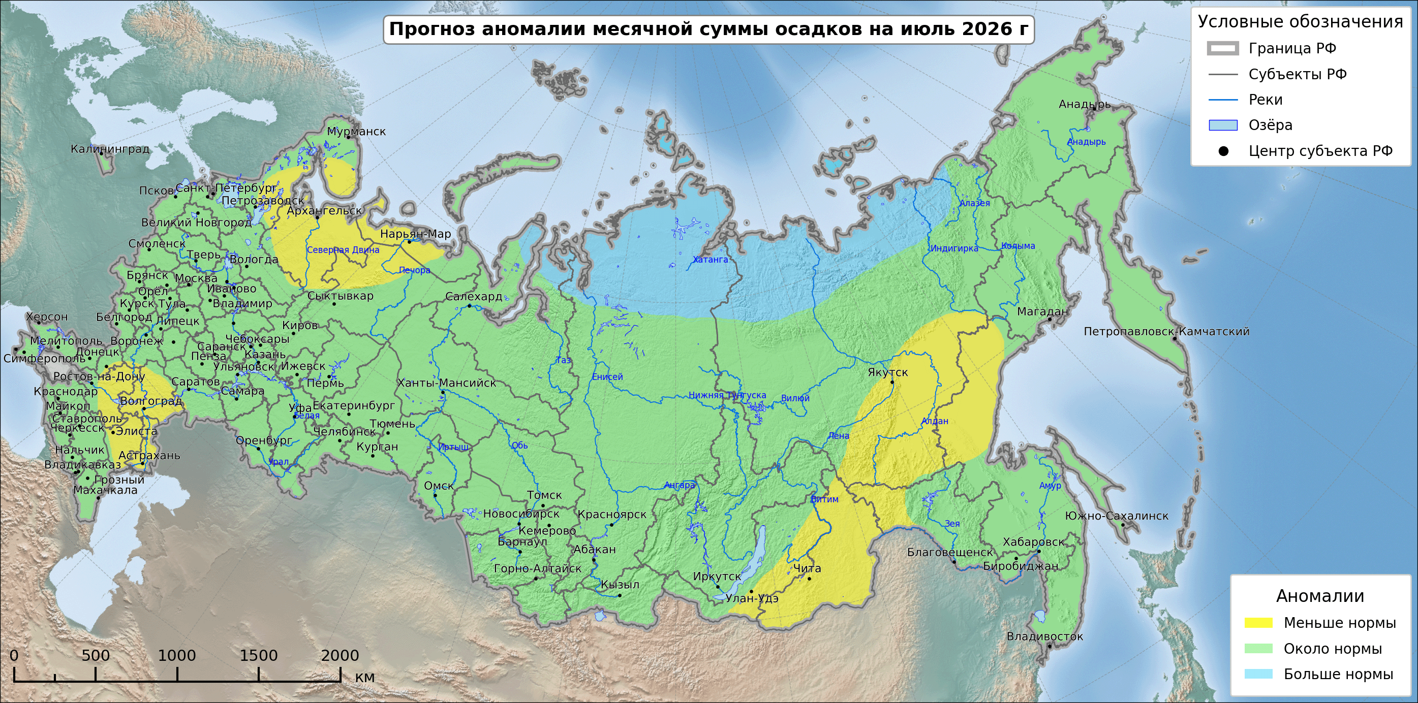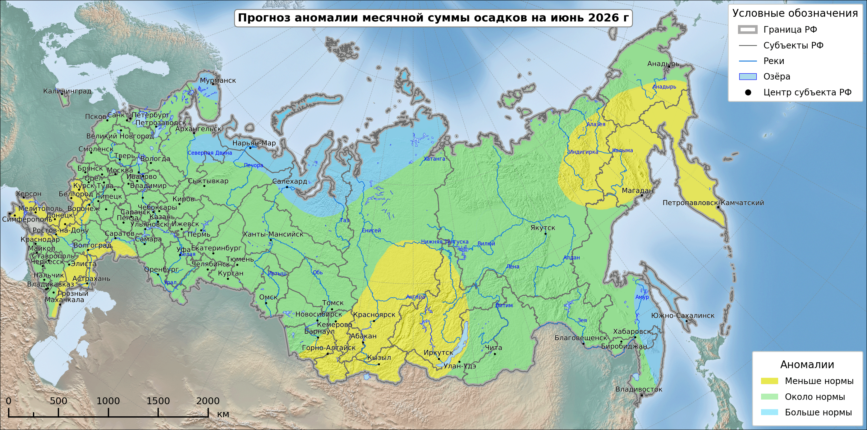 Дефицит осадков ожидается в Ленинградской области, в Карелии, на востоке Северо Западного федерального округа, на большей части Южного федерального округа и на востоке Северо-Кавказского федерального округа, на юге Приволжского и Сибирского федеральных округов, на севере Уральского федерального округа и на Таймыре. Избыток осадков наиболее вероятен в Мурманской области, на юге Дальневосточного федерального округа и на севере Якутии.