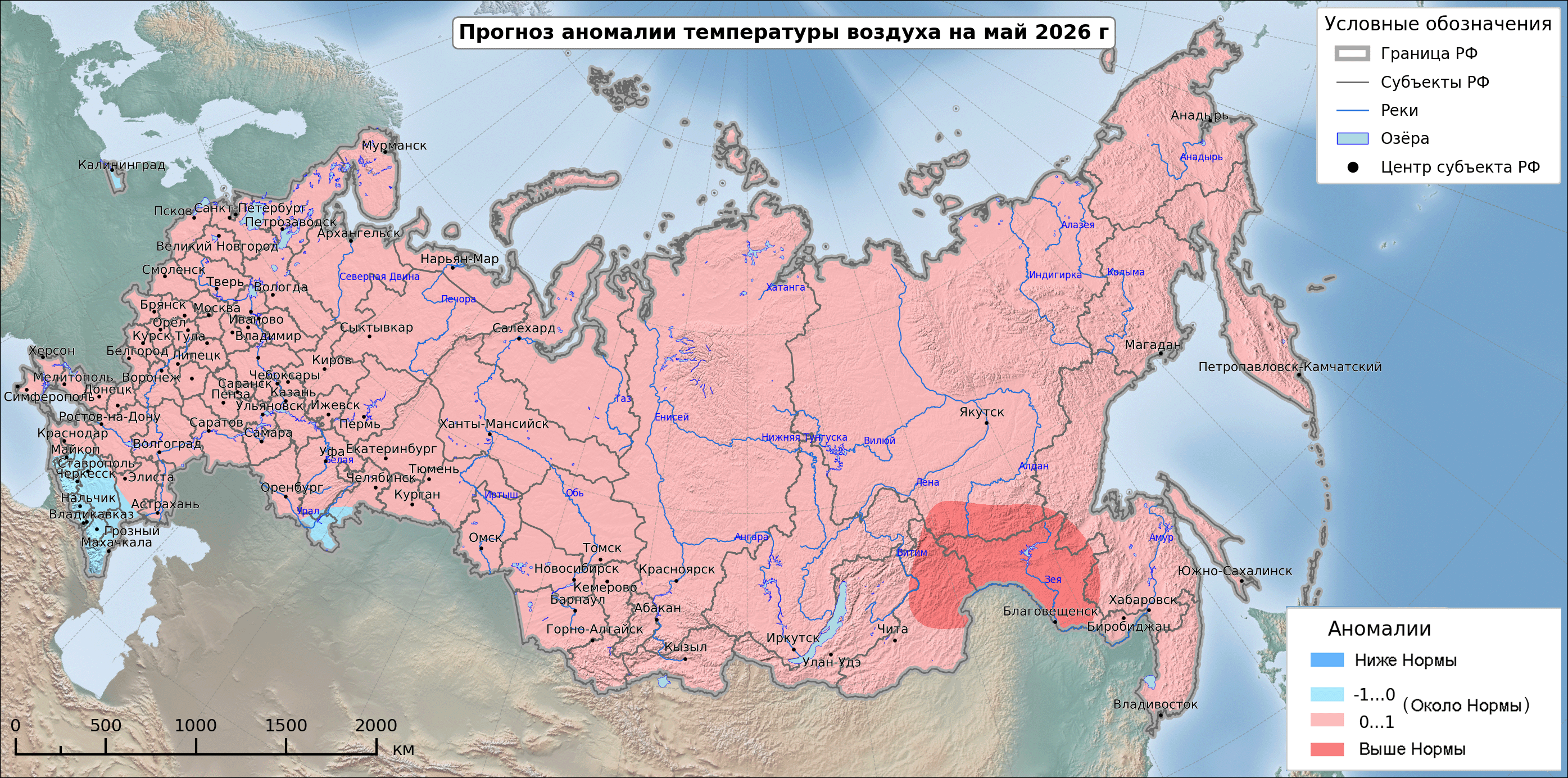 Выше нормы средняя месячная температура наиболее вероятна на Алтае, в Республике Тыва, на большей части Якутии, на севере Хабаровского края и на западе Магаданской области.