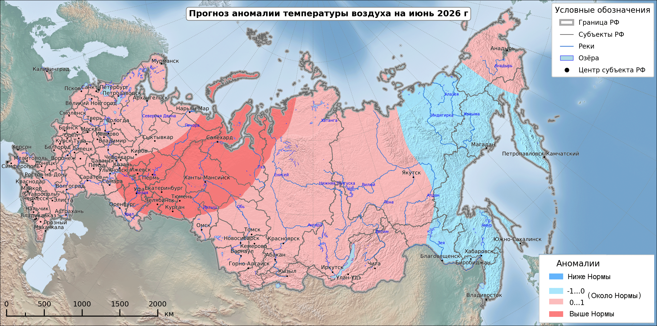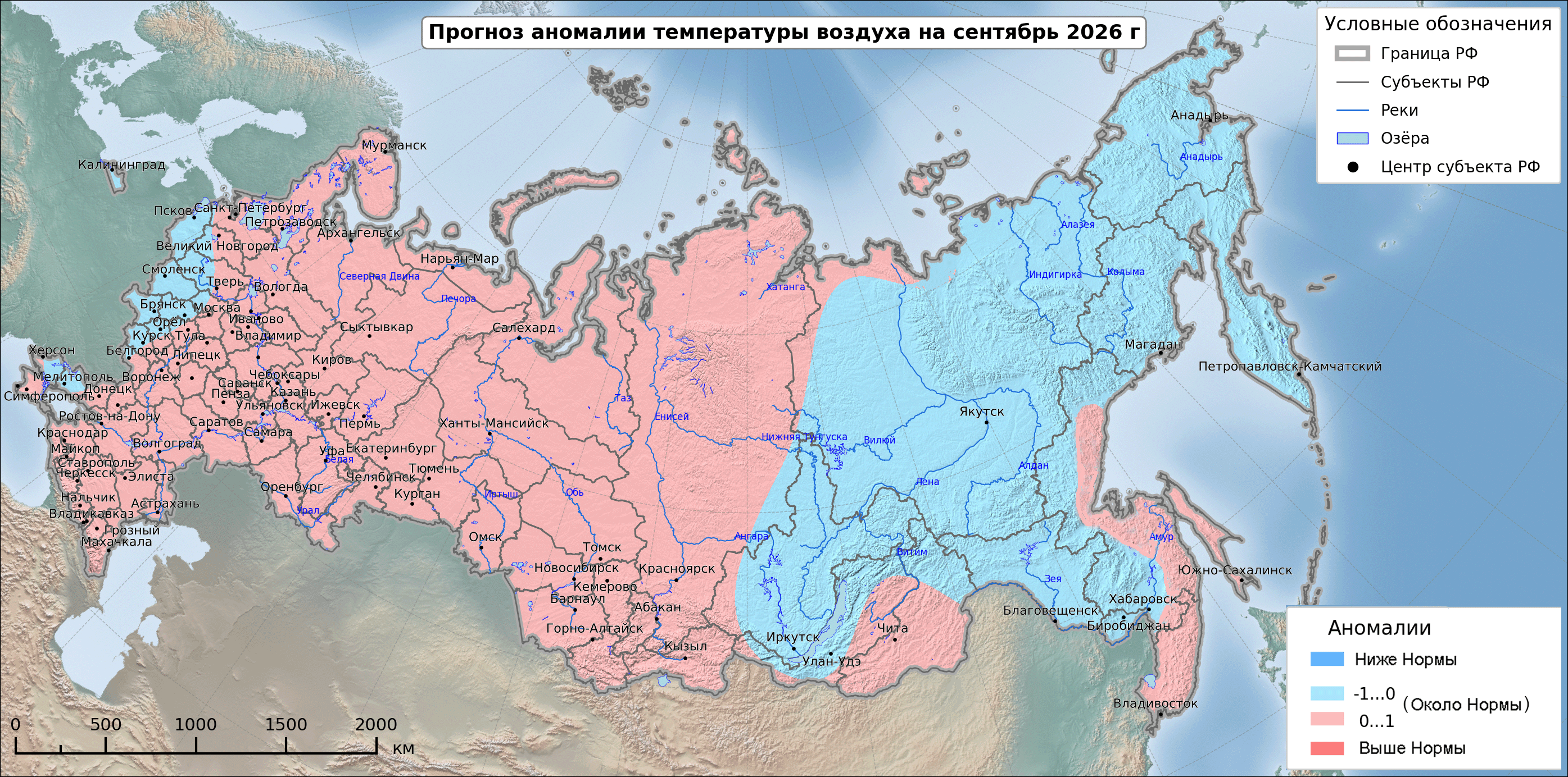Выше нормы средняя месячная температура предполагается на востоке Северо Западного, Центрального и Южного федеральных округов, в Приволжском федеральном округе, на большей части Уральского федерального округа, на Таймыре. Больше нормы месячное количество осадков предполагается на севере Сибирского федерального округа и на севере Якутии.