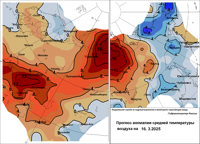 Так, в Забайкалье дневная температура во второй половине текущей недели отрицательная от -1 до -7°, местами до -10…-15°. Только в воскресенье до слабой оттепели, до +1…+2°. В Амурской области еще холоднее, 14 марта дневная температура -4…-9°, местами до -15°, 14 марта на юге -2…-7°. В Хабаровском крае тоже до конца недели без оттепели, -2…-7°, местами до -10…-13°. Похолодает в выходные дни в Приморском крае. Если 14 марта днем +3…+8°, в центральных районах до 0°, то 15 марта днем от -1 до +4°, 16 марта от -2 до +3°. Осадки 15 и 16 марта практически прекратятся, только местами возможен небольшой снег. На Сахалине дневная температура существенно не изменится, на севере от -2 до -8°, на юге от 0 до -5°. 16 марта установится погода без осадков. В Камчатском крае циклон вызовет потепление. На юге края 14 марта термометры покажут -2…-7°, 15 марта -5…0°, 16 марта +2…-3°. Ослабление мороза ожидается и в северной половине Камчатского края, 14 и 15 марта от -9 до -15°, 16 марта -4…-9°.
