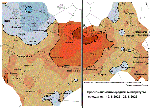 19-21 августа. В Мурманской области сильный дождь, ветер 15-20 м/с (19 августа на побережье до 27 м/с). В южных районах Красноярского края, в Бурятии сильный дождь, гроза.