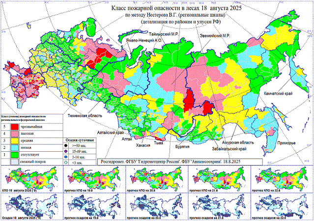 Высокая, местами чрезвычайная пожарная опасность 19-20 августа в Ненецком а.о., Тыве, 19-21 августа в Коми, на юге Воронежской области, в Южном и Северо-Кавказском федеральных округах, в Донецкой, Луганской Народных Республиках, Херсонской и Запорожской областях, Ханты-Мансийском а.о., на севере Красноярского края и Иркутской области, на западе Якутии и Чукотки.