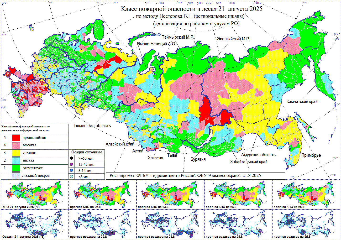 Высокая, местами чрезвычайная пожарная опасность 22 августа в Ком, 22-24 августа в Архангельской области, на юге Воронежской, Белгородской и Саратовской областей, в Южном и Северо-Кавказском федеральных округах, в Донецкой, Луганской Народных Республиках, Херсонской и Запорожской областях, Ханты-Мансийском а.о., в Томской области, на юге Республики Алтай, западе Тывы, севере Красноярского края и Иркутской области, на западе Якутии и Чукотского а.о.