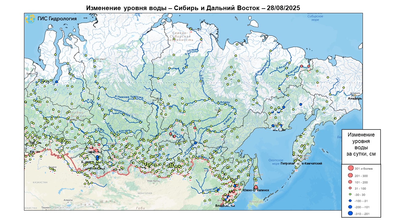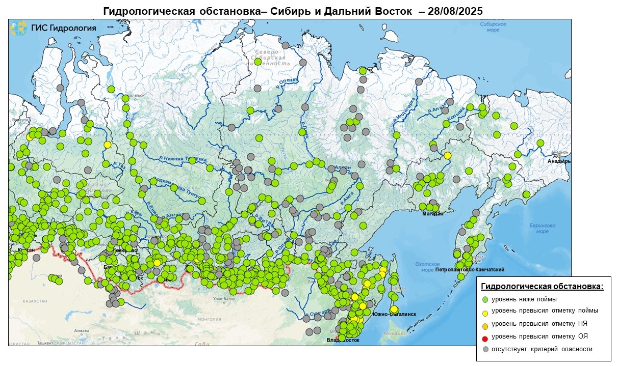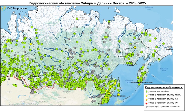 28 августа – 1 сентября на р. Большая Уссурка у п. Вагутон и г. Дальнереченск, р. Малиновка у с. Ракитное и с. Веденка возможно достижение уровнем воды отметки неблагоприятного гидрологического явления; 27-31 августа на реках бассейна Японского моря и р. Уссури (Приморский край) существует угроза подтопления пониженных территорий, хозяйственных объектов, участков дорог, сельхозугодий дождевым, склоновым и русловым стоком.