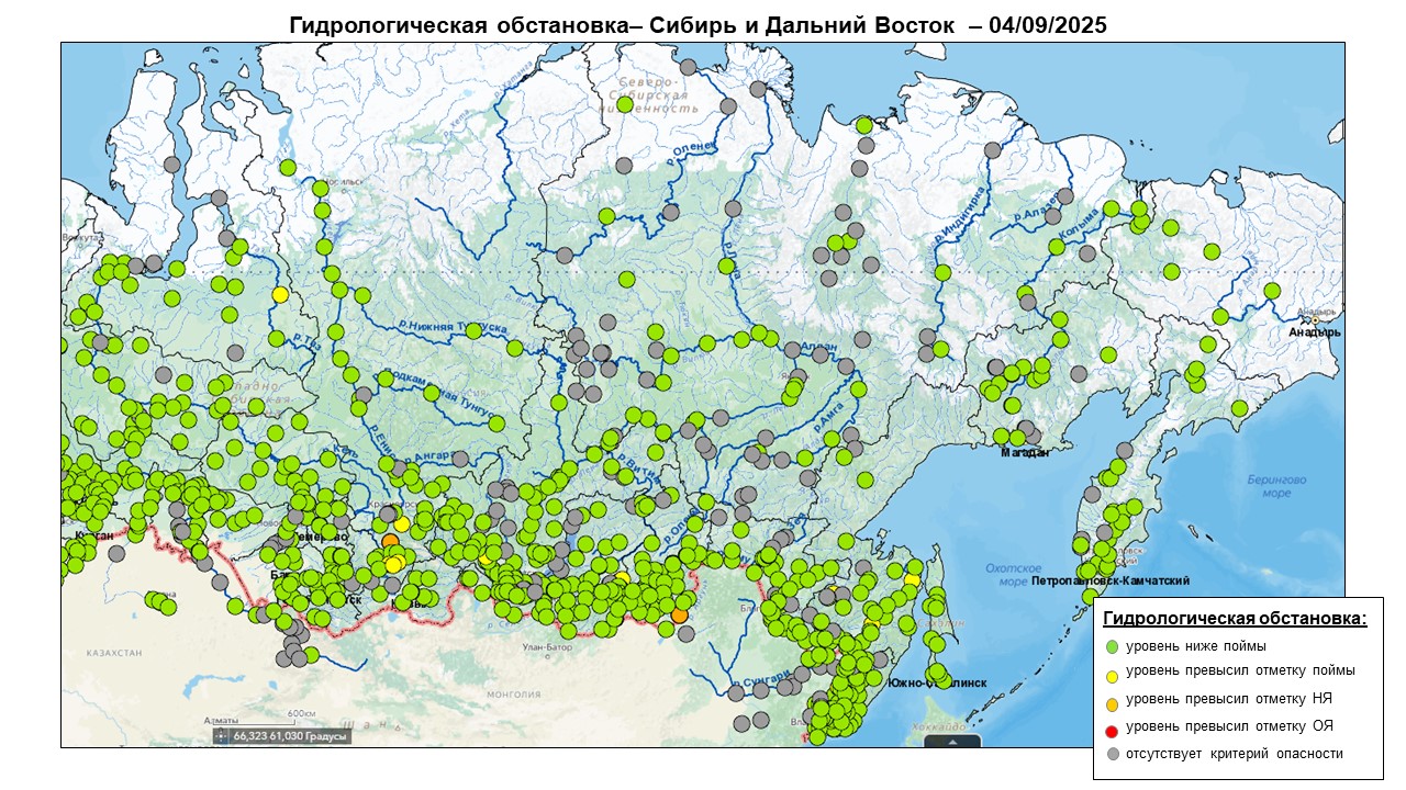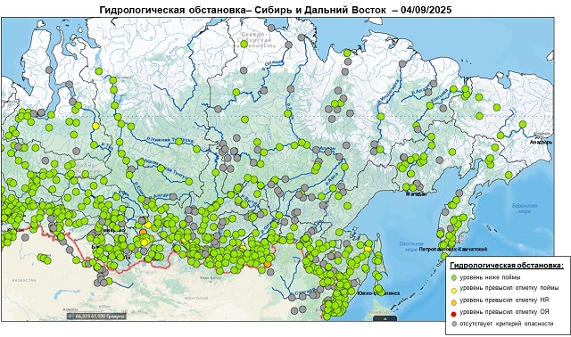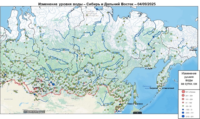 Уровень воды превышает неблагоприятную отметку на р. Сыда у с. Отрок, р. Кача у г. Красноярск, р. Большой Кемчуг у с. Большой Кемчуг (Красноярский край), р. Аргунь у с. Новоцурухайтуй (Забайкальский край) (Рисунок 3, 4).