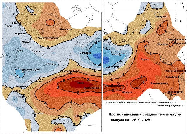 Обширная депрессия, растянувшаяся от северо-запада ЕТР до востока Якутии, обеспечит сильными осадками (23 сентября - в виде дождя, снега, мокрого снега; 24-26 сентября - в виде снега) восточные и северные районы Якутии. На остальной территории пройдут дожди от небольших до умеренных. 26 сентября на арктическом побережье ветер усилится до 17-22 м/с. На юге, юго-западе температурный фон будет еще высокий, аномалии максимальной температуры достигнут +7…+8 градусов, а воздух прогреется до +12…+18 градусов. 26 сентября значительно похолодает до +7…+12 градусов на юге, а наиболее низкая дневная температура воздуха 0…-5 градусов планируется на северо-западе.
