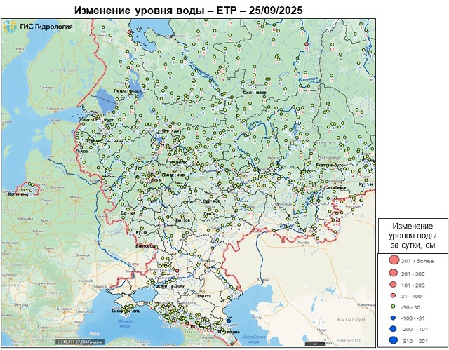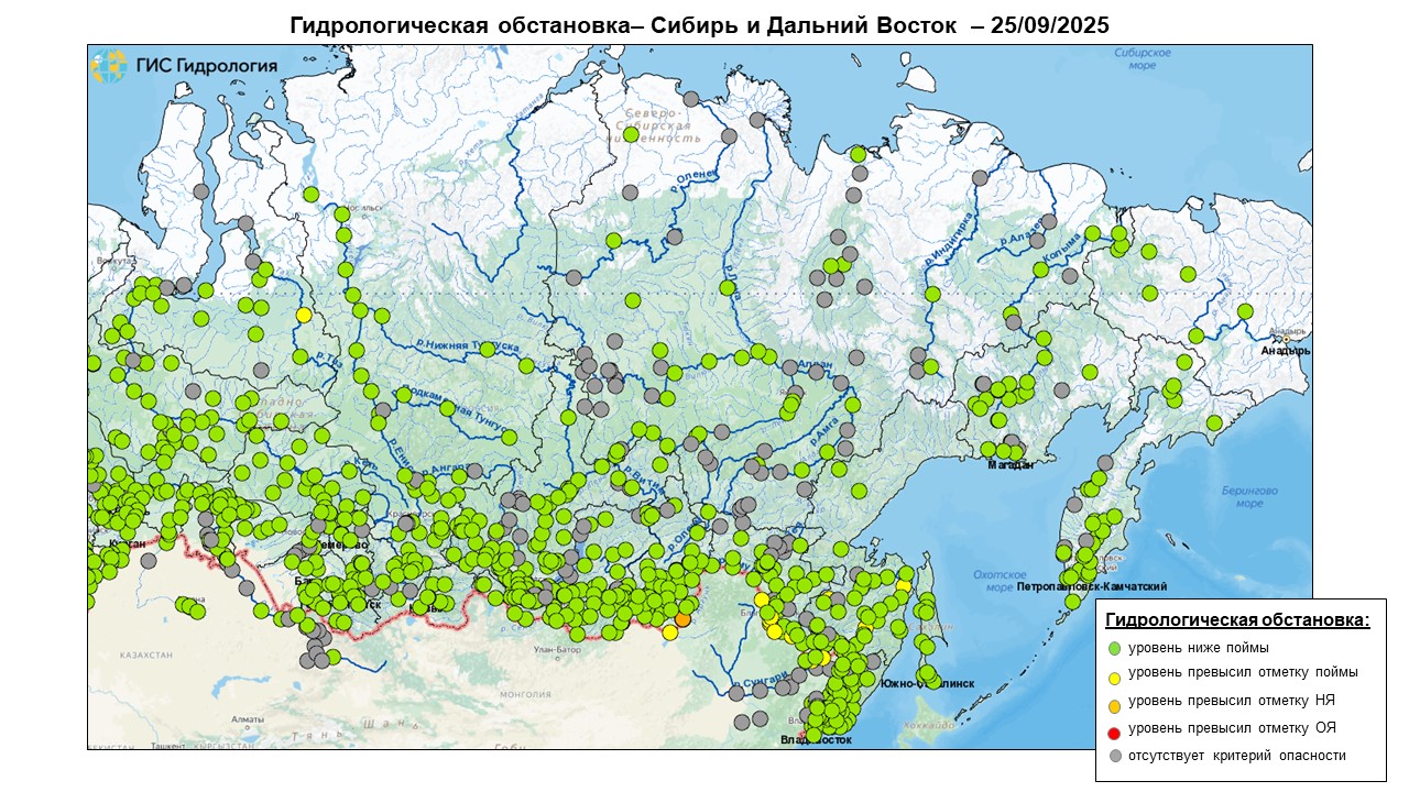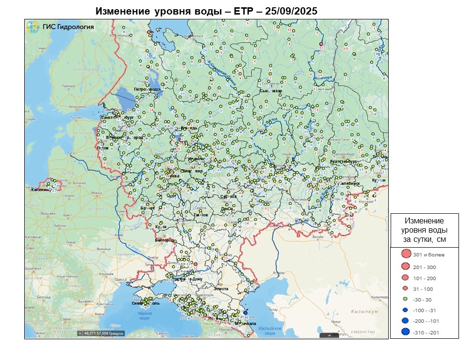 Уровень воды ниже неблагоприятно низкой отметки наблюдается местами на р. Вычегда и р. Печора (Коми), р. Мста (Новгородская область); уровень воды ниже опасно низкой отметки – на р. Ока (Московская область), р. Вятка (Кировская область), р. Яна и р. Индигирка (Якутия); низкая межень – на реках Республики Крым (Рисунок 3, 4).