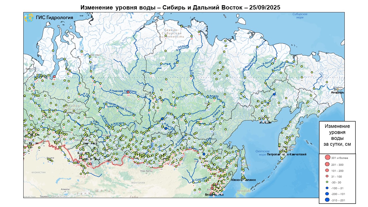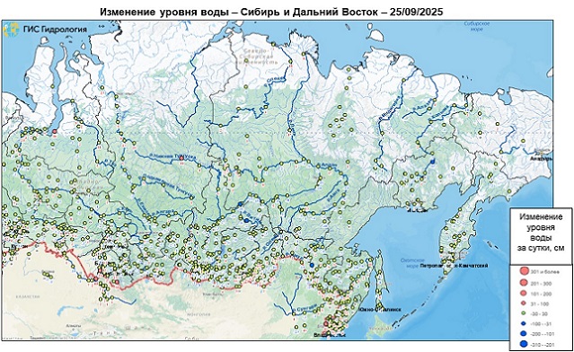 Рост уровня воды (на 0,4-0,6 м) наблюдается местами на реках Карелии, Коми, Ненецкого а.о., Ямало-Ненецкого а.о., Алтайского края, Республики Алтай, Красноярского края (Рисунок 1, 2).
