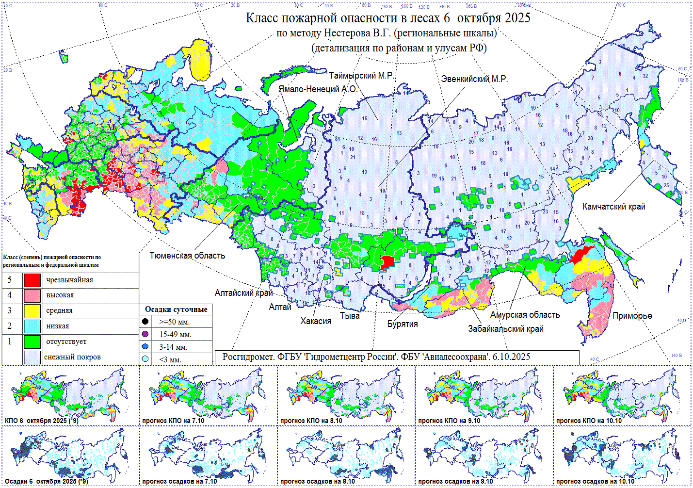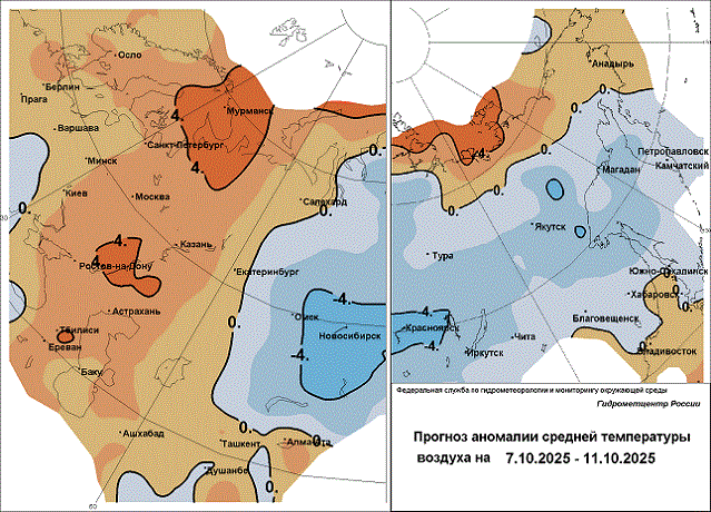 7 октября. В горах Хакасии сильные осадки (снег, мокрый снег). В Забайкальском крае сильные осадки (снег, мокрый снег), установление снежного покрова, на дорогах снежный накат и гололедица, ветер 25 м/с и более, понижение температуры на 8° и более. В Амурской области сильные осадки (дождь, снег, мокрый снег), гололедные явления, ветер до 15 м/с. В Чукотском автономном округе дождь, ветер до 23 м/с.
