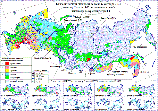 Высокая, местами чрезвычайная пожарная опасность 7-9 октября в южной половине Приволжского, на северо-востоке Южного федеральных округов, на крайнем юге Забайкальского и Хабаровского краев, в Приморском крае.