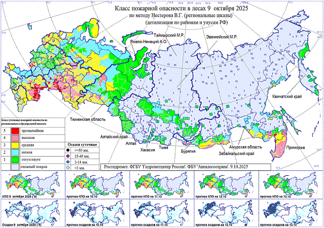 10-12 октября. В Ставропольском крае, Карачаево-Черкесии, Кабардино-Балкарии сильный дождь, ливневый дождь (в горных и высокогорных районах с мокрым снегом), гроза, град, ветер 20-25 м/с. На побережье Магаданской области ветер 17-22 м/с (10 октября до 24 м/с). В Камчатском крае дождь, снег (10-11 октября на юге сильные осадки), в прибрежных районах ветер 25-30 м/с (на юго-западном побережье и на побережье Олюторского района до 35 м/с).