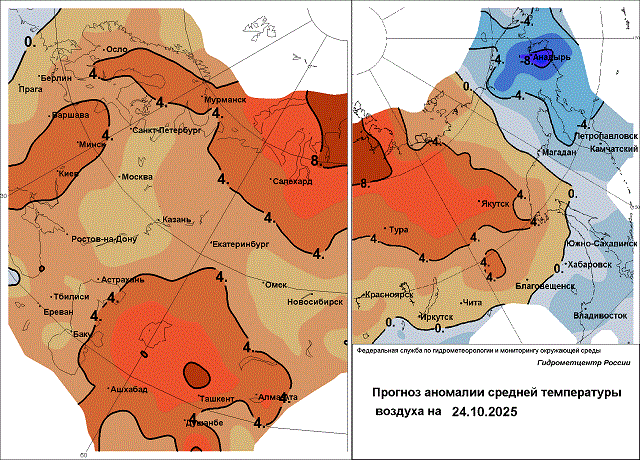 В северных регионах Красноярского края на Таймыре, в Эвенкии, Туруханском районе в предстоящие дни 22-24 октября пройдёт небольшой и умеренный снег, мокрый снег, вызванный циклоном с центром в акватории Карского моря и его атмосферными фронтами. 23 октября на Таймырском полуострове ветер усилится до 13-18 м/с, заметут метели. Температурный фон очень высокий, максимальная температура воздуха превысит климатическую норму на Таймыре на 7-8 градусов, а 25-26 октября аномалия достигнет +11…+12 градусов. В Эвенкии и Туруханском районе дневная температура будет выше нормы на 3-4 градуса. Ночью холоднее всего в Эвенкии, столбики термометров опустятся до -5…-10 градусов, местами – до -15…-20 градусов; в Туруханском районе и на Таймыре морозы слабее: -1…-8, местами -12 градусов. Днём повсеместно температура воздуха будет удерживаться в пределах от -4 до +2 градусов, на Таймыре в четверг составит -1…-6 градусов, а в Эвенкии в пятницу 0…-5, местами -10 градусов.