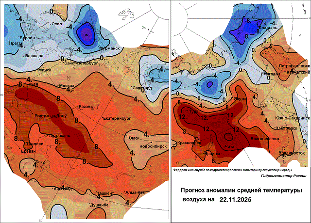 20 ноября на Чукотке мела метель, ветер достигал 25 м/с. 22-24 ноября небольшой снег ожидается лишь местами, ветер усилится 22 ноября до 22 м/с, 23 ноября в районе Певека задует со скоростью 23-28 м/с. 23-24 ноября крепкие морозы немного спадут и составят -22…-27, местами -12…-17 градусов, в континентальной части при прояснениях -32..-37, в центральных и восточных районах повышение до -2…-7 градусов.