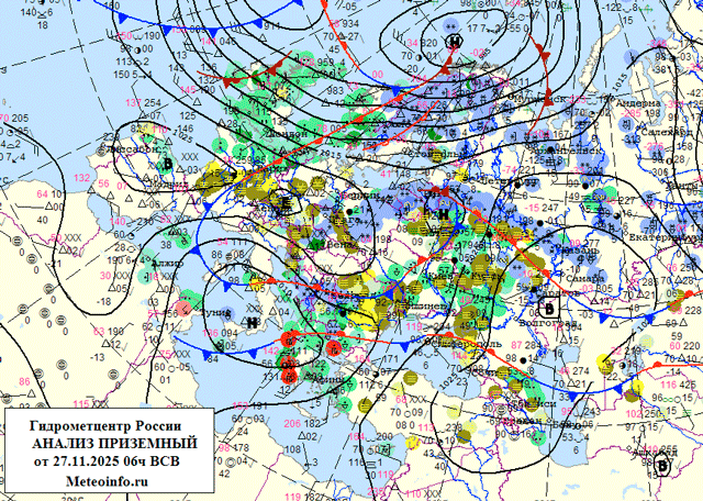В четверг, 27 ноября, облачно. Небольшой дождь, местами умеренный. Tемпература в Москве 5...7°, по области 2...7°. Ветер южный 4-9 м/с.