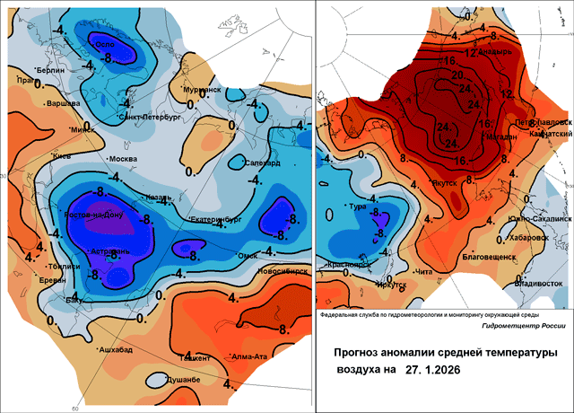 27 января. В Калининградской области ночью осадки (снег, дождь), гололед. В Вологодской области ночью сильный снег. В Республике Коми снег, гололедно-изморозевые отложения. В Смоленской области сильный снег, мокрый снег, гололед. Во Владимирской области сильный снег. В Брянской области осадки в виде снега, мокрого снега и дождя, гололед. В Донецкой Народной Республике снег, мокрый снег, налипание мокрого снега, гололедно-изморозевые отложения, ветер 15-20 м/с. В Ростовской области осадки в виде снега, мокрого снега, дождя и ледяного дождя, гололедно-изморозевые явления. В Крыму дождь, ветер 17-22 м/с. В Краснодарском крае осадки в виде снега, мокрого снега, дождя и ледяного дождя, в районе Новороссийска ветер до 20 м/с, ночью и утром сильный гололед, сильное налипание мокрого снега, сильные гололедно-изморозевые явления. В Адыгее ночью и утром сильный гололед. В Северо-Кавказском федеральном округе осадки в виде снега, мокрого снега и дождя, гололедно-изморозевые явления, в Ставропольском крае ветер до 23 м/с. В Челябинской, Курганской, Омской областях, на юге Тюменской области аномально холодная погода. В Томской области аномально холодная погода, сильный мороз (температура до -41°). На севере Хабаровского края снег, метель, ветер 15-20 м/с. В Магаданской области ночью сильный снег, на побережье метель, ветер 19-24 м/с.