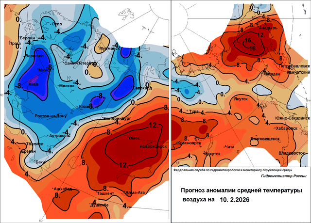 10 февраля. В Краснодарском крае в горах выше 500-1000 м лавиноопасно, ночью и утром (исключая МО Сочи) очень сильные осадки (дождь, снег, мокрый снег), очень сильный снег, сильное налипание мокрого снега, сильное гололедно-изморозевое отложение, сильный гололед, в районе Анапа-Геленджик ветер 20-22 м/с. В горах Адыгеи выше 500 м, Ингушетии, Чеченской Республики выше 1000 м, в Северо-Байкальском районе Бурятии лавиноопасно. В Северо-Кавказском федеральном округе (исключая Кабардино-Балкарию и Дагестан) ночью и утром сильные осадки (дождь, снег, мокрый снег), сильный снег, ветер 15-20 м/с, в горах Кабардино-Балкарии до 23 м/с. В Челябинской области сильный снег, гололедно-изморозевое отложение. В Магаданской области и на арктическом побережье Якутии снег, метель, ветер 17-22 м/с. На севере Курильской гряды снег, ветер 20-25 м/с. В Камчатском крае снег (на севере сильный), метель, ветер 25-30 м/с.