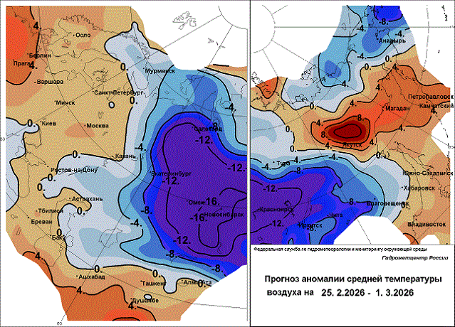 25-27 февраля. В Краснодарском крае: в горах (исключая МО Сочи) выше 1000 м лавиноопасно; 26-27 февраля на черноморском побережье в районе Анапа-Геленджик ветер 22-25 м/с. В горах Адыгеи выше 1000 м лавиноопасно. В Ингушетии и Чеченской Республике: в горах выше 1000 м лавиноопасно; 26 февраля в горах Ингушетии ветер до 22 м/с; 27 февраля сильные осадки (дождь, снег, мокрый снег, в горах сильный снег. В Омской области, на юге Тюменской области, Алтайском крае аномально холодная погода, сильный мороз (температура ночью -42…-37°).