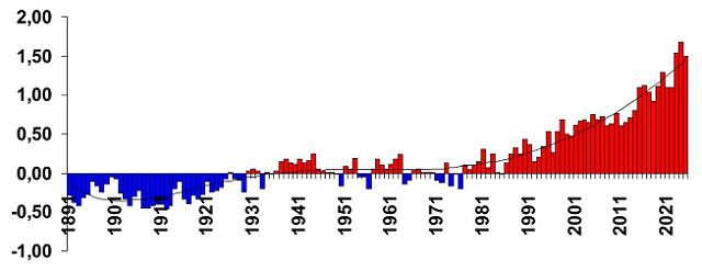 Прошедший 2025 г. стал на Северном полушарии 3-м самым теплым в метеорологической истории с 1891 г. Его среднегодовая температура уступает только рекордному достижению прошлого 2024 года, а также 2023 году.