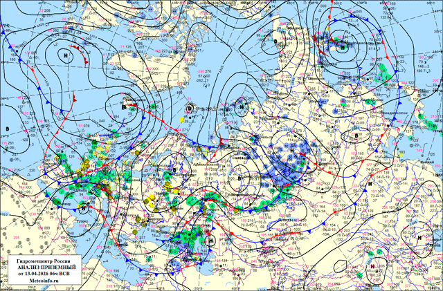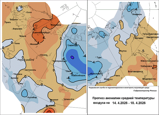 14 апреля. На юге Приволжского федерального округа дождь (ночью сильный), гроза, град. В Донецкой Народной Республике заморозки (температура до -3°). На севере Астраханской области и в Калмыкии ночью сильный дождь со снегом, гроза, ветер 15-20 м/с. В Адыгее дождь, гроза, град, ветер 15-20 м/с. В прибрежных районах Магаданской области снег, метель, ветер 19-24 м/с. На севере Камчатского края мокрый снег, ветер 25-30 м/с.