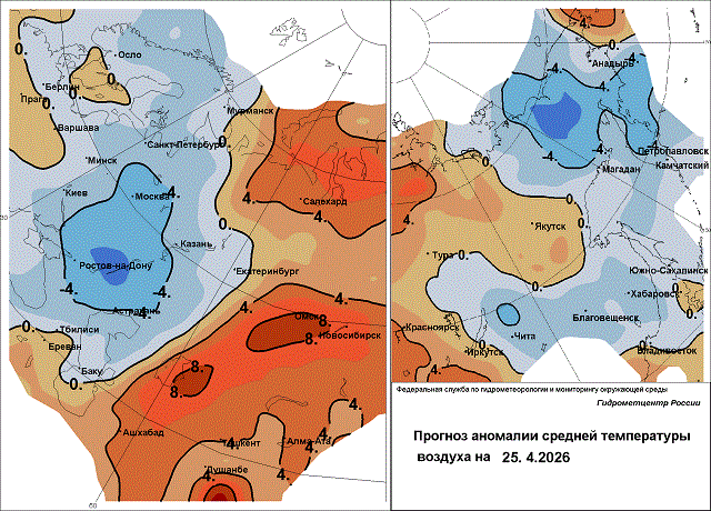 22 апреля при прохождении холодного атмосферного фронта в Краснодарском крае в горной зоне Сочи отмечался очень сильный снег, на М Горная Карусель в период с 07 до 19 ч выпало до 20,6 мм осадков, 22 - ночью 23 апреля сильные осадки в виде дождя, ледяного дождя, снега оставили до 37 мм влаги, ночью 23 апреля зарегистрированы заморозки до -0,1 градуса. Минувшей ночью заморозки до -2 градусов также наблюдались в Крыму, до -1…-3 градусов - в Калмыкии и Ростовской области.