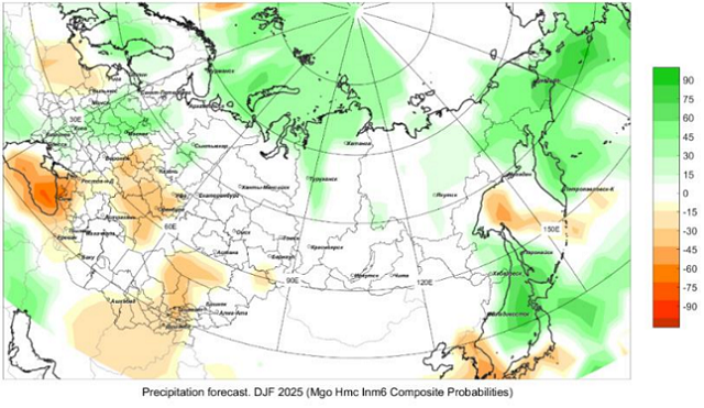 В прогнозе распределения осадков присутствует неопределенность. Очаги с сигналом о дефиците осадков находятся на юго-западе ЕТР, Поволжье, Узбекистане, кроме западных районов, Туркмении, исключая северо-запад, западе и местами в южной половине Казахстана и на юго-востоке Центральной Азии. Избыток осадков прогнозируется в Молдове, на западе Украины, на востоке Беларуси, в западной части ЕТР, в полярных районах Сибири, на севере Красноярского края, на северо-востоке РФ, Камчатском полуострове, местами на юге Хабаровского и Приморского краев. С вероятностью 30% превышение нормы осадков ожидается на востоке Якутии.