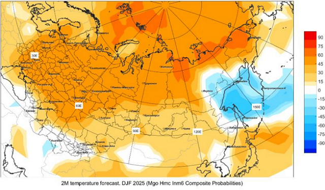 Прогноз температурного режима был составлен на основе данных трех российских моделей ПЛАВ, ГГО и ИВМ. Зимний сезон 2025-26 гг. на бо́льшей части территории Северной Евразии ожидается теплее средних многолетних значений. Высокая вероятность положительных аномалий прогнозируется на севере Якутии и Чукотском полуострове. В южных районах Сибири и на юго-западе Дальнего Востока России вероятность теплого сезона около 30%. Область отрицательных аномалий ожидается на побережье Охотского моря и Камчатском полуострове.