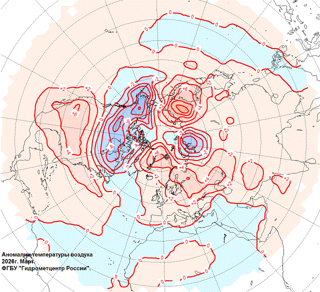 Аномалии температуры воздуха на Северном полушарии в марте 2026 г.