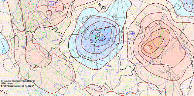 Аномалии температуры воздуха в России в марте 2026 г.